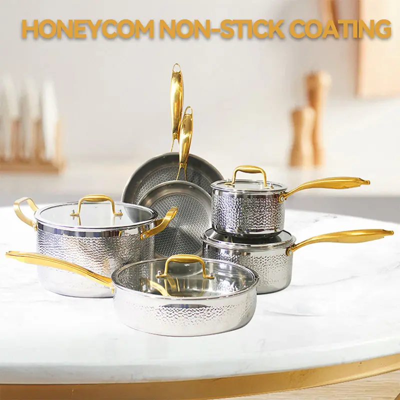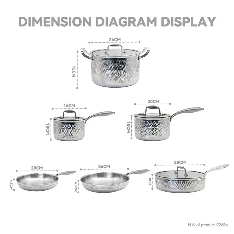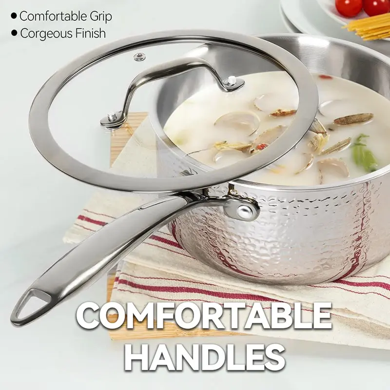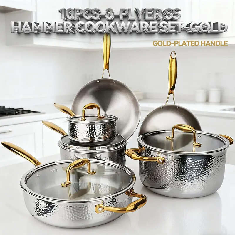 STYLISH HAMMERED DESIGN WITH GOLD ACCENTS* The hammered texture hides scratches and adds elegant charm, while gold-tone handles elevate your kitchen aesthetics. Perfect for serving directly at the table, ideal for dinner parties, Instagram-worthy meals, or luxury housewarming gifts.