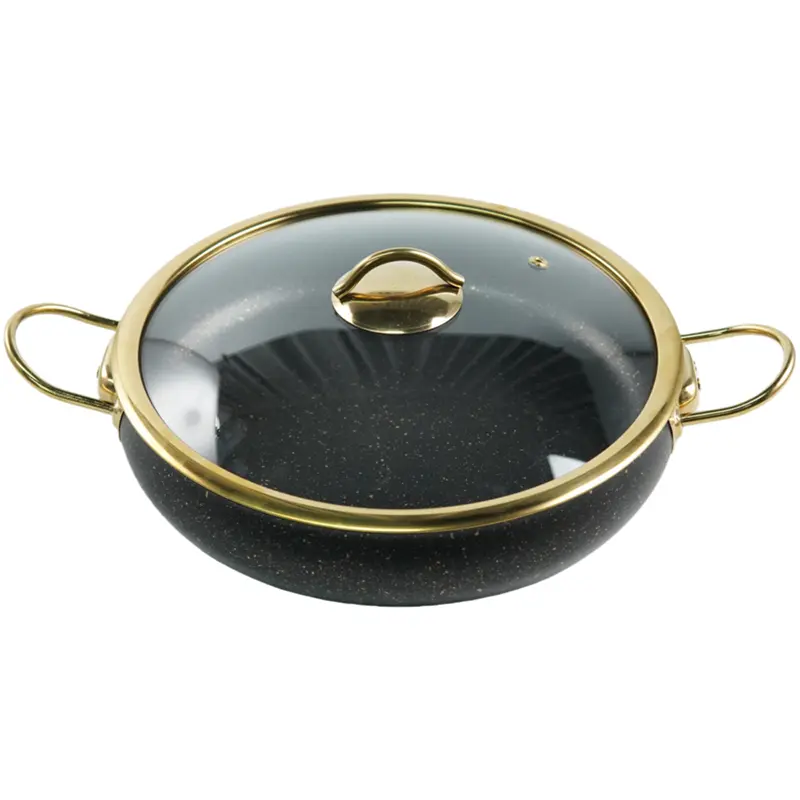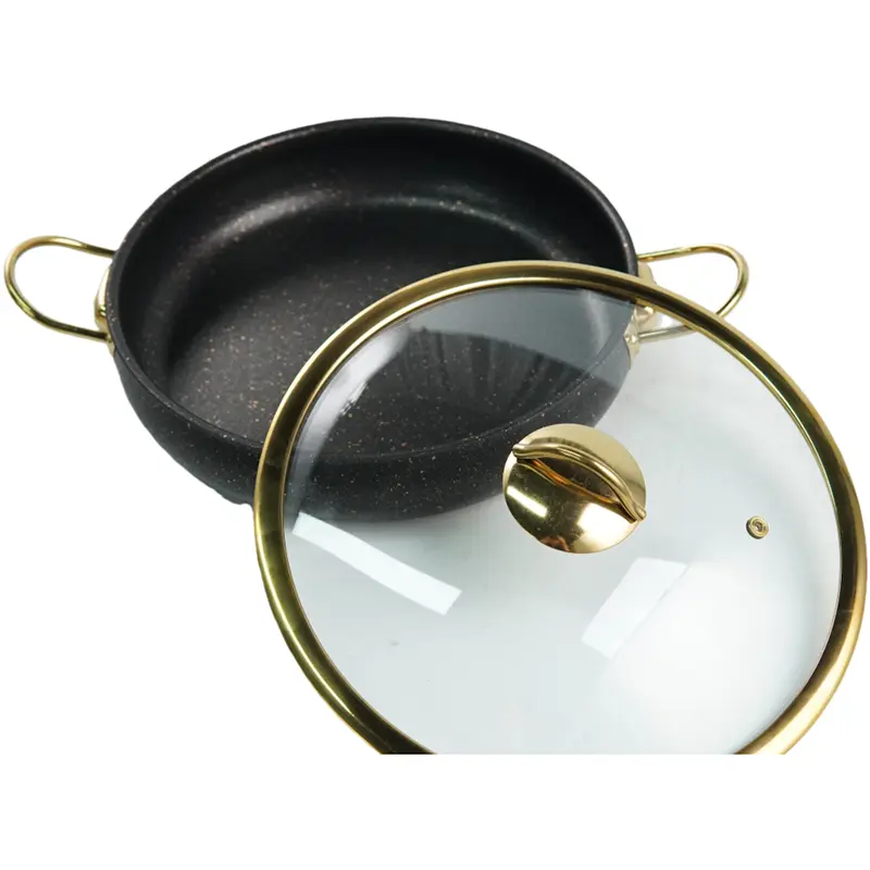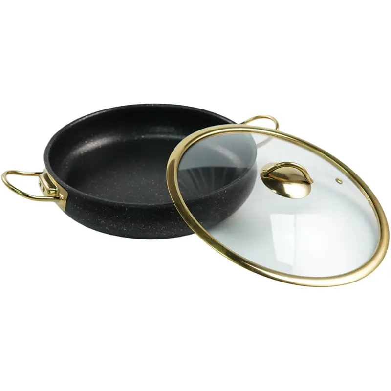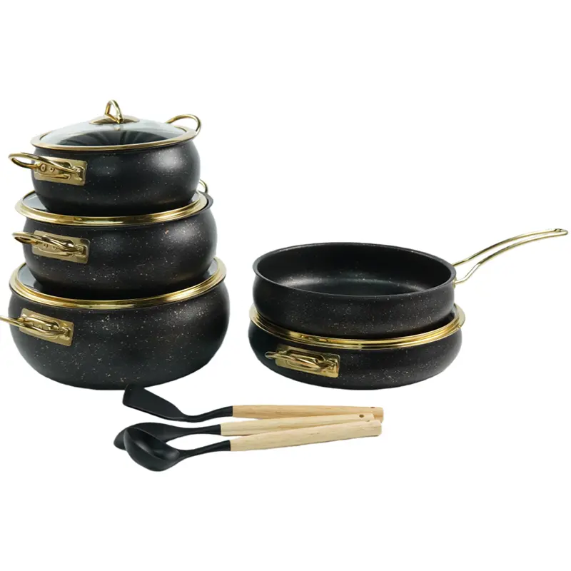 【Stylish Design Meets Functionality】— Transform your kitchen’s vibe with our sleek, modern cookware set in an elegant midnight-black finish with golden flecks. The double stay-cool golden handles ensure easy handling, making it perfect for both cooking and serving. It’s a seamless mix of style and smarts—turning every meal into a premium moment